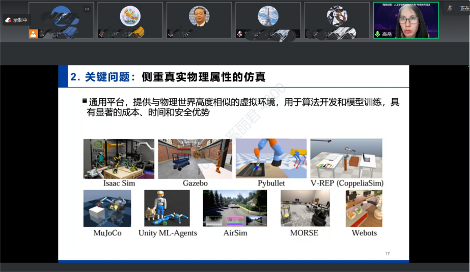 高岳教授以一段人形机器人视频导入,从“具身智能发展”“人形机器人发展”“足式机器人应用”“未来挑战与展望”四个方面,向老师们具体介绍了具身智能概念、分类、脉络梳理以及具身智能算法、感知和数据处理、具身仿真、可靠决策等关键问题,讲解了具身智能大模型等具身智能的发展,以最新研究进展视频展示了人形机器人、足式机器人的发展现状以及概念内涵,并阐述了人形机器人的未来挑战与展望。她的报告不仅有丰富生动的国内外机器人发展现状视频,而且还结合了个人研发冬奥会滑雪和冰壶六足机器人的科研经历。在培训过程中,她始终注重互动,老师们受到报告启发纷纷提出问题,高岳教授一一解答了老师们对智能驾驶发展、运动机器人等问题。