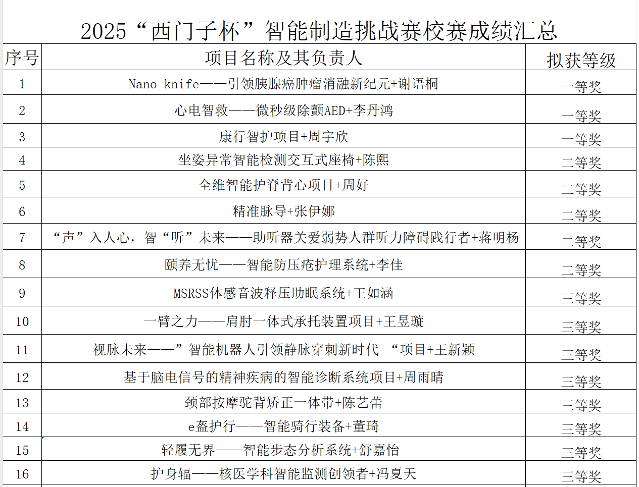 本次校内选拔赛共收到26项作品,遵循公平、公正、公开的原则,经过作品申报、项目初审、专家打分等程序,从产品创意,市场策略,技术方案,原型机制作等方面按照60%的获奖比例,设置一、二、三等奖(其中一等奖3项、二等奖5项、三等奖8项),现将获奖名单公示如下(详见附件)。公示时间:2025年6月6日至2025年6月12日。