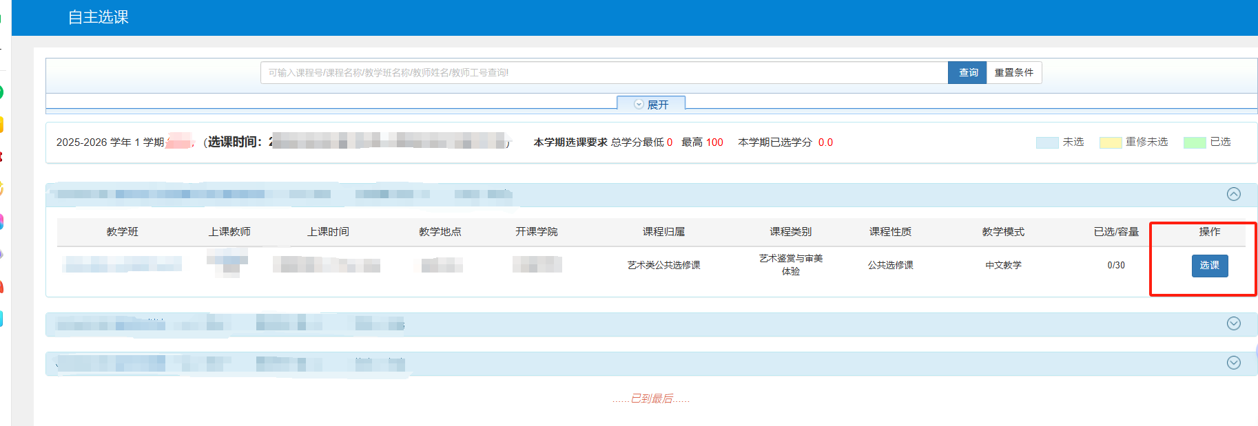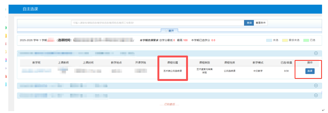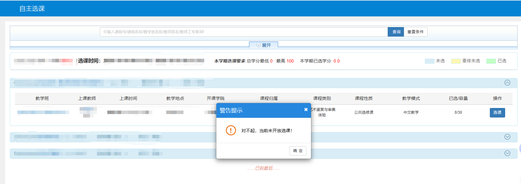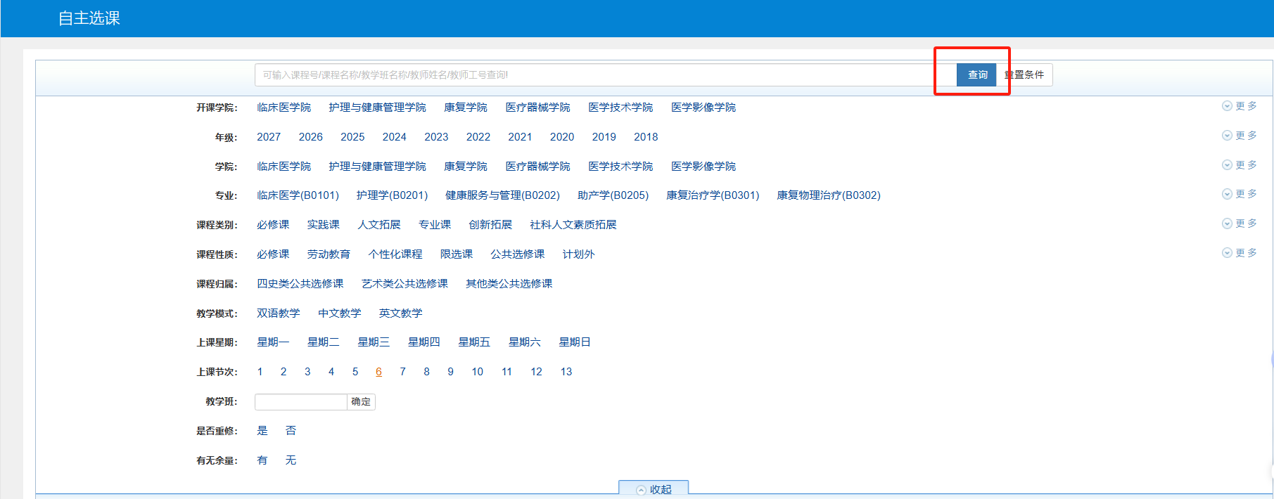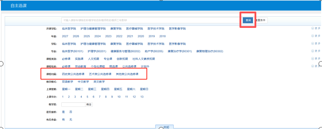 注:下方筛选条件不进行任何选择时,默认为查询所有可选课程