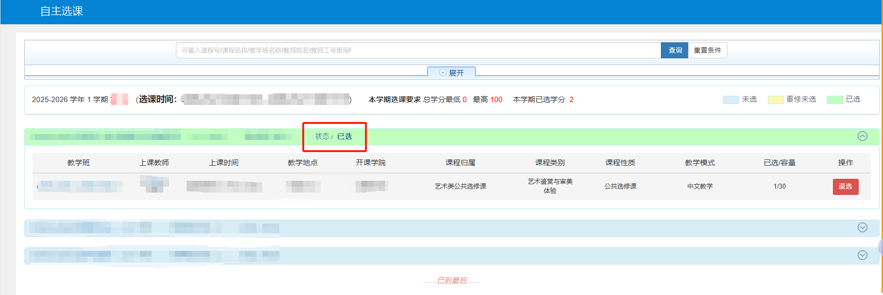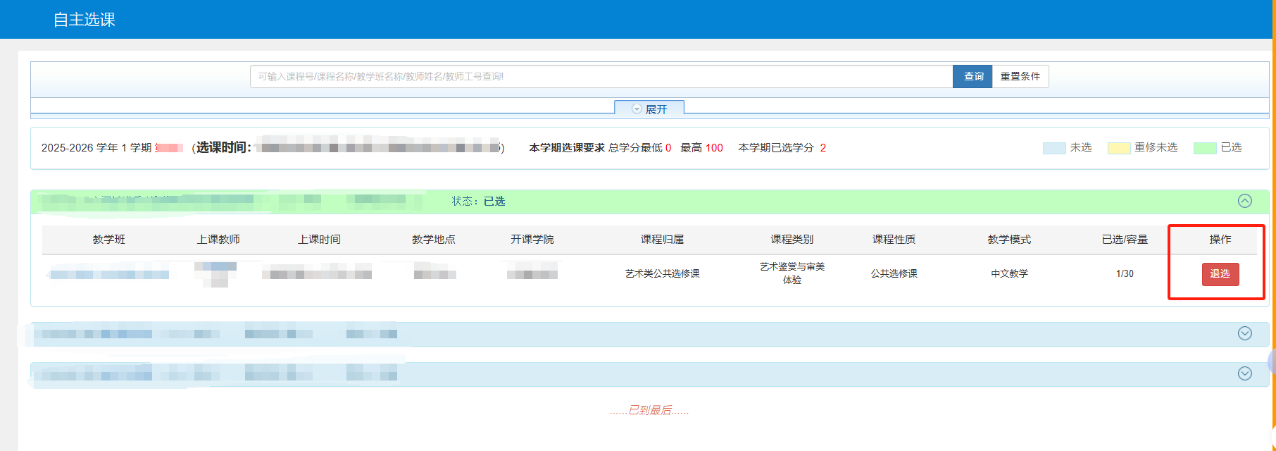 5. 如选错或者有更改意向,请点击“退课”更改并重新选课。