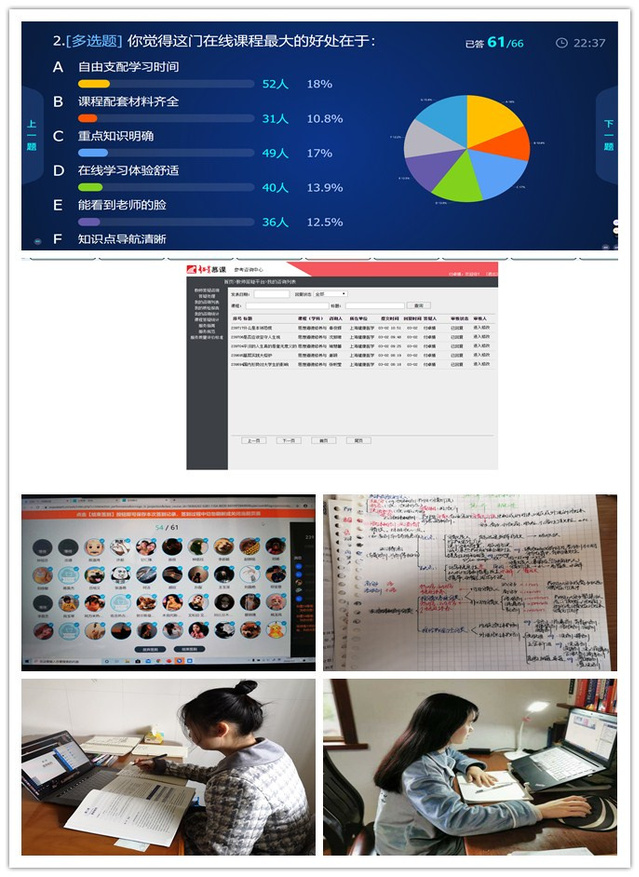 通过在线学习,同学们纷纷表示:“在家进行在线学习,是一名新时代大学生对抗疫应尽的责任与担当。全新的授课方式,以及诸多各具优势的学习平台,能够尝试不一样的学习过程,收获不一样的学习体验,纵使困顿难行,一样砥砺奋进。”学生们也很是享受在线课程带来的新感受和经历,他们感受到了老师们准备的线上教学种种的用心良苦,自主学习主动,学习有心得有收获。正如老师们所言:“在线课堂对老师和学生都不容易,尝试在线教学是‘教无定法’的极好诠释,两相结合,博采众长,方显‘教学有道’。”“上好‘各种课’是我们的责任和使命,愿今后的教学之路,无论在线还是线下,都能砥砺前行,不忘初心”。停课不停学,在线学习也精彩。