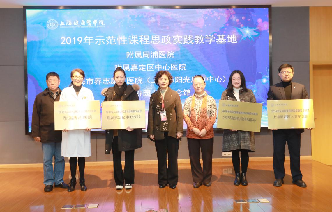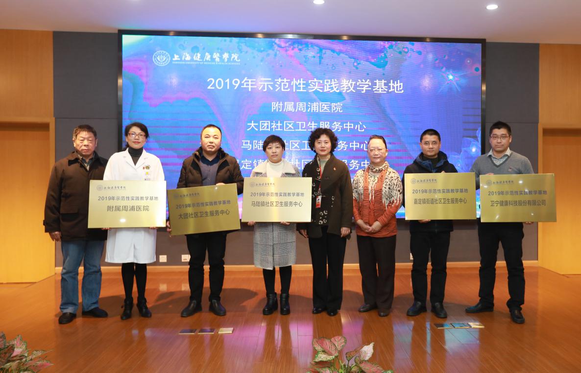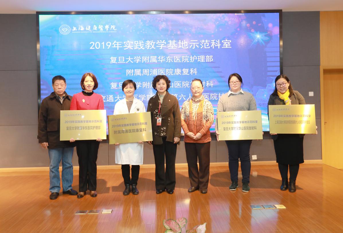 会上,领导和专家共同为2019年评选出的5家示范性实践教学基地:附属周浦医院,大团、马陆镇、嘉定镇街道社区卫生服务中心,卫宁健康科技股份有限公司;4家实践教学基地示范科室:复旦附属华东医院护理部、附属周浦医院康复科、复旦附属华山医院放射科、交大附属六院护理部;4家示范性课程思政实践教学基地:附属周浦医院、附属嘉中心、市养志康复医院、上海福寿园人文纪念馆;2家示范性通识教育实践教学基地:现代医学教育博物馆、中译语通信息科技(上海)有限公司进行了授牌。