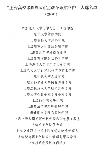 近日,中共上海市教育卫生工作委员会、上海市教育委员会发布了《关于公布2019年“上海高校课程领航计划”评选结果的通知》,经过前期的材料初审、书面评审、答辩终审等环节,上海市最终评选出了10所“上海高校课程思政整体改革领航高校”和20所“上海高校课程思政重点改革领航学院”,我校临床医学院入选“上海高校课程思政重点改革领航学院”。