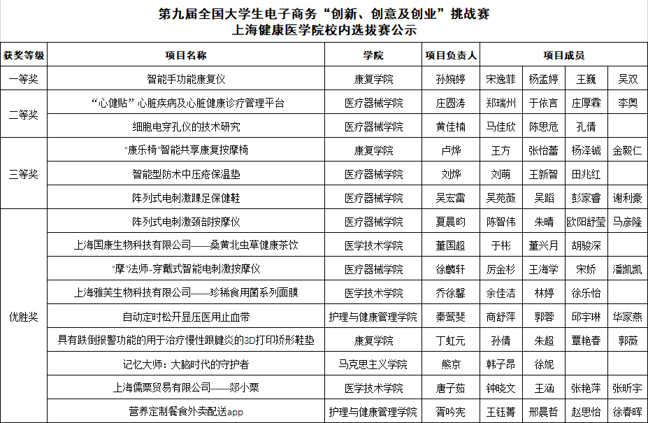 通过激烈的角逐,本届“三创赛”上海健康医学院校级选拔赛共决出一等奖1个,二等奖2个,三等奖3个及优胜奖9个。15个项目将代表学校参加上海市决赛。
