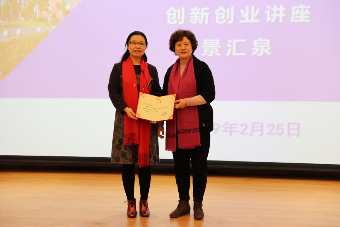 讲座开始前,唐红梅副校长给景老师正式颁发了聘书,特别聘请景老师为学校的创新创业导师。接着,唐红梅副校长向景老师和在座师生简单介绍了学校建校三年以来创新创业教育工作的开展情况和所取得的成绩,并对学校2019年创新创业教育工作表达了期许。