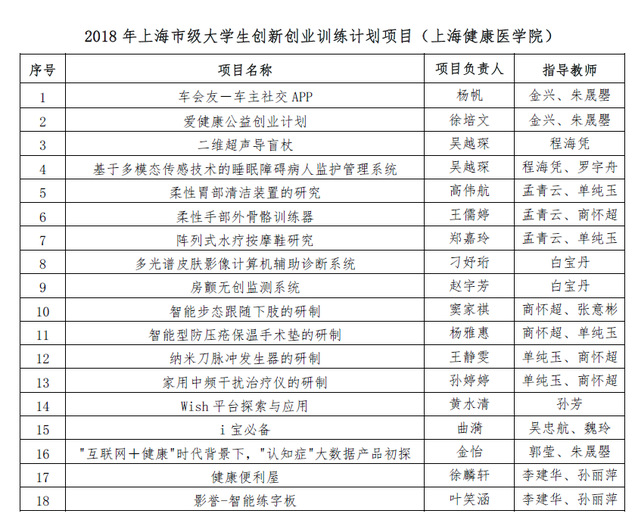 接《上海市教育委员会关于公布2018年上海市级大学生创新创业训练计划项目的通知》(沪教委高〔2018〕37号),我校《车会友—车主社交APP》等18个项目获批2018年大学生创新创业训练计划项目。这是我校首次获批上海市级大学生创新创业训练计划项目。同时,经市教委推荐,我校有5个项目正在申报国家级大学生创新创业训练计划项目。