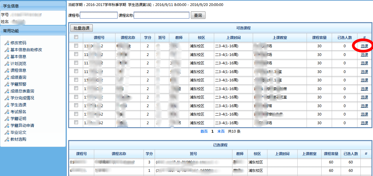 1、 点击菜单“学生选课”
