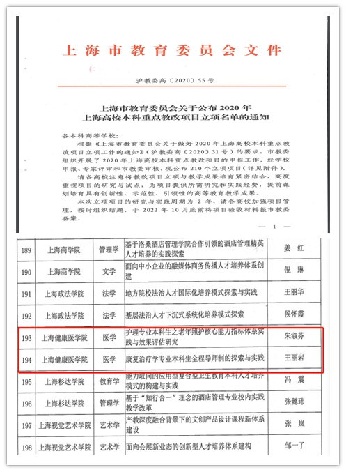 近日,上海市教委发布《上海市教育委员会关于公布2020年上海高校本科重点教改项目立项名单的通知》(沪教委高〔2020〕55号),批准并公布了共210项2020年上海高校本科重点教学改革项目的名单。我校护管学院朱淑芬老师主持的《护理专业本科生之老年照护核心能力指标体系实践与效果评估研究》、康复学院王丽岩老师主持的《康复治疗学专业本科生全程导师制的探索与实践》两个项目获批。