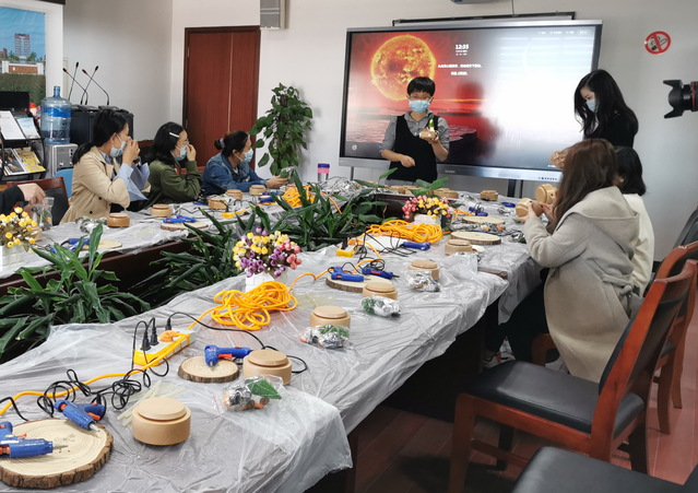 各位女教工通过选择好自己喜欢的配件,比如小树,南瓜,兔子等等,把小配件按照自己的想法摆放好,然后用胶枪将其固定住,最后把灯带绕在小配件上,在欢乐中一件件富有个性的艺术品就完成。