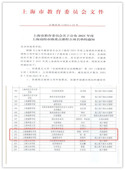 近日,上海市教委发布了《上海市教育委员会关于公布2021年度上海高校市级重点课程立项名单的通知》(沪教委高〔2021〕34号),我校《名画中的瘟疫史》(在线课程)、《天然药物化学》(线下课程)、《健康管理学》(线上线下混合式课程)等3门课程获批2021年度上海市教委本科重点课程立项。