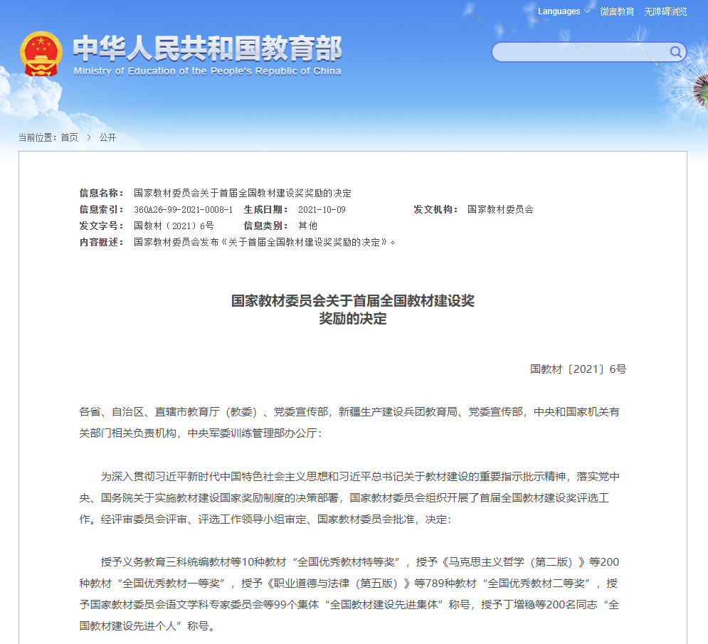 全国教材建设奖是教材领域的最高奖,是检阅、展示教材建设服务党和国家人才培养成果,增强教材工作者荣誉感、责任感,推动构建中国特色、世界水平教材体系的一项重大制度。同时,也是新中国成立以来,开展的首届教材建设工作的专项奖励。