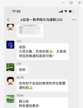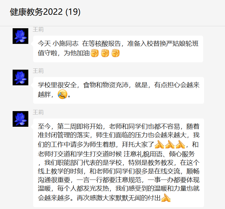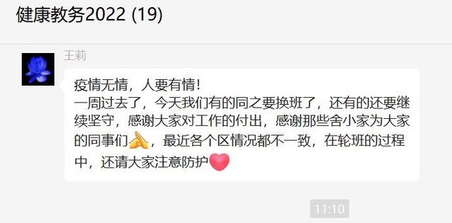 支部书记王莉深入一线值守期间,仍时刻不忘关心教工疫情期间的身心健康,通过微信工作群谆谆叮嘱,提振信心、鼓舞士气,用实际行动展示党员领导干部的政治本色和担当作为。