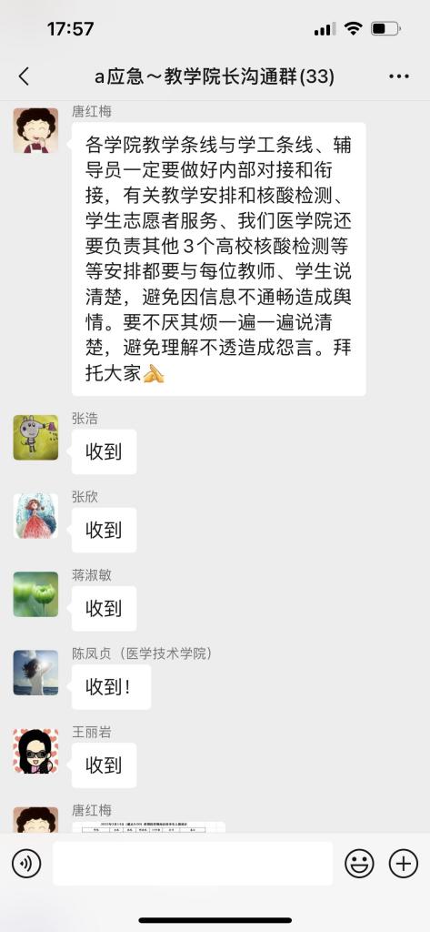 非常时期,身处校外的支部党员们,有的积极响应支部号召,加入所在社区成为一名光荣的“小蓝”,联系特殊就医、引导居民核酸检测、物资搬运工作;有的在居家隔离中,仍深深地牵挂着坚守校园的同事们,积极开展居家在线工作,组织督导在线随堂听课、组织征集教学案例、组织培训和发布征文、紧锣密鼓的开展评建资料的统计收集和整理。党员们虽然身处各地,但心却依然紧密地联系在一起,在各自工作岗位上都是冲锋在前。