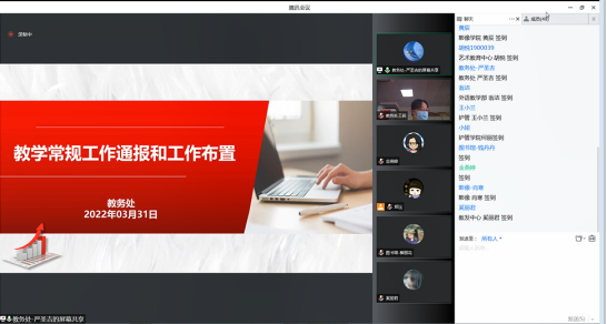 本学期开展实施线上教学以来,学校领导始终对教学工作高度重视和精准指导,教务处、各学院(部、中心)以及广大教师所承担的工作内容、工作难度及付出都远超线下教学,但始终坚守教育初心,保持认真负责的工作态度和良好的精神风貌,线上教学有条不紊、效果良好,得到校外教学督导的一致好评。本次教学工作例会是学校进入准封闭管理以来的第2次线上教学工作会议,会议就线上教学工作开展情况进行了阶段性总结,也根据目前非常严峻的新冠疫情防控形势进行了研判和下一步工作布置,为线上常规教学、本科教学工作合格评估以及年度教育教学重点工作等各项教学工作的有序推进打下了很好的基础,也为各学院(部、中心)的下一步教学工作开展指明了方向。