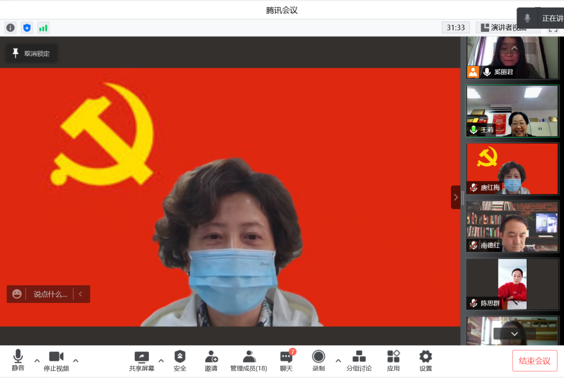 最后,唐红梅副书记、副校长讲话。她指出面临疫情大考,党员首先要保持头脑清醒,坚定理想信念,做到不信谣、不传谣,同时也要主动亮出党员身份,做弘扬正能量的宣传者和防控科普的传播者。其次要保持身体健康,她详细介绍了各种消毒步骤和要点,嘱咐做社区志愿者和居家隔离的老师做好科学防护。最后要坚持党建促业务,充分发挥先锋模范作用,围绕中心抓党建、抓好党建促中心,做到一名党员就是一面旗帜。